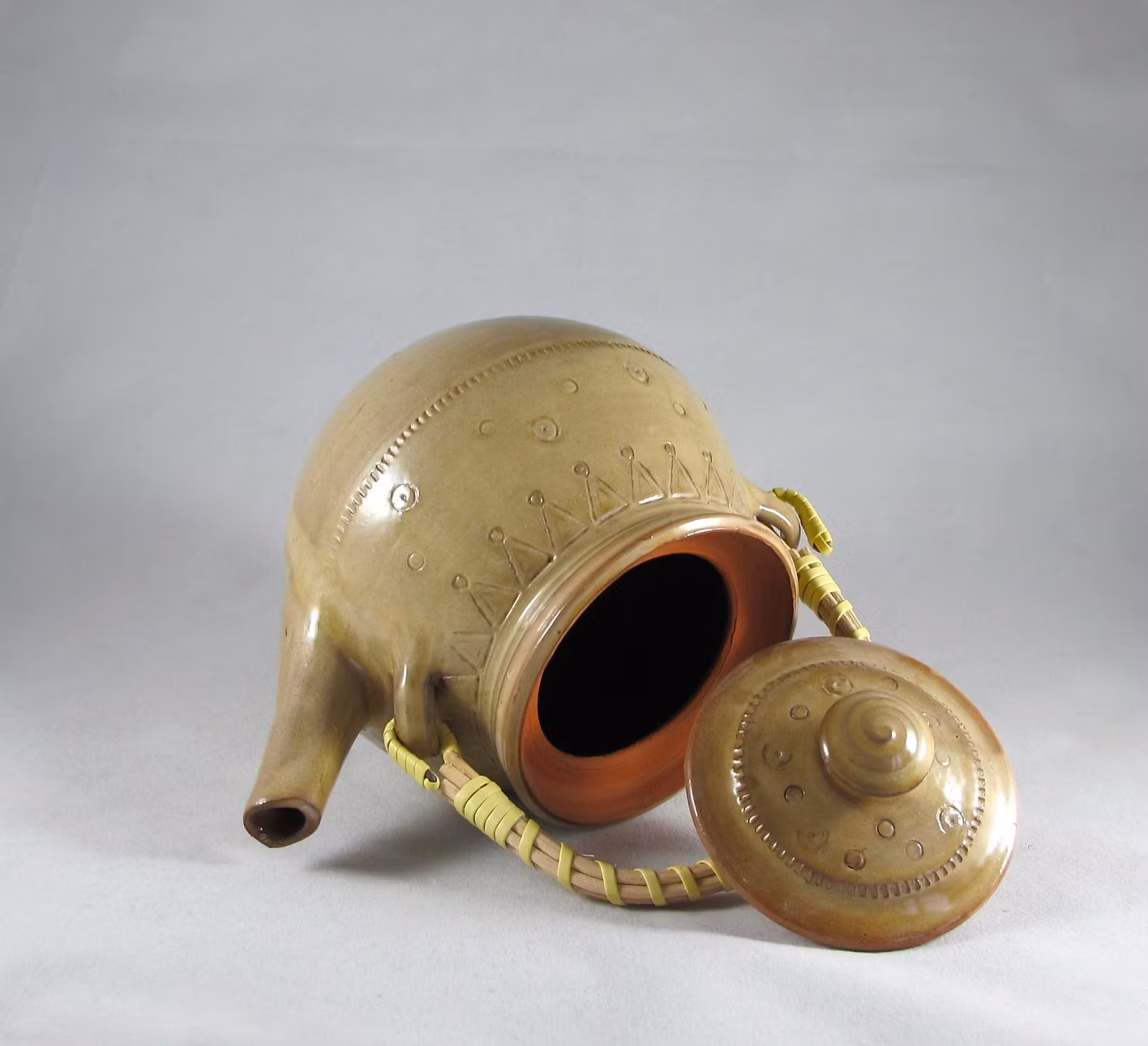 En tekanna med mönster på överdel och lock. Drejad i röd lera och begjuten med en vit lera och därefter glaserad. Insidan är även den glaserad.