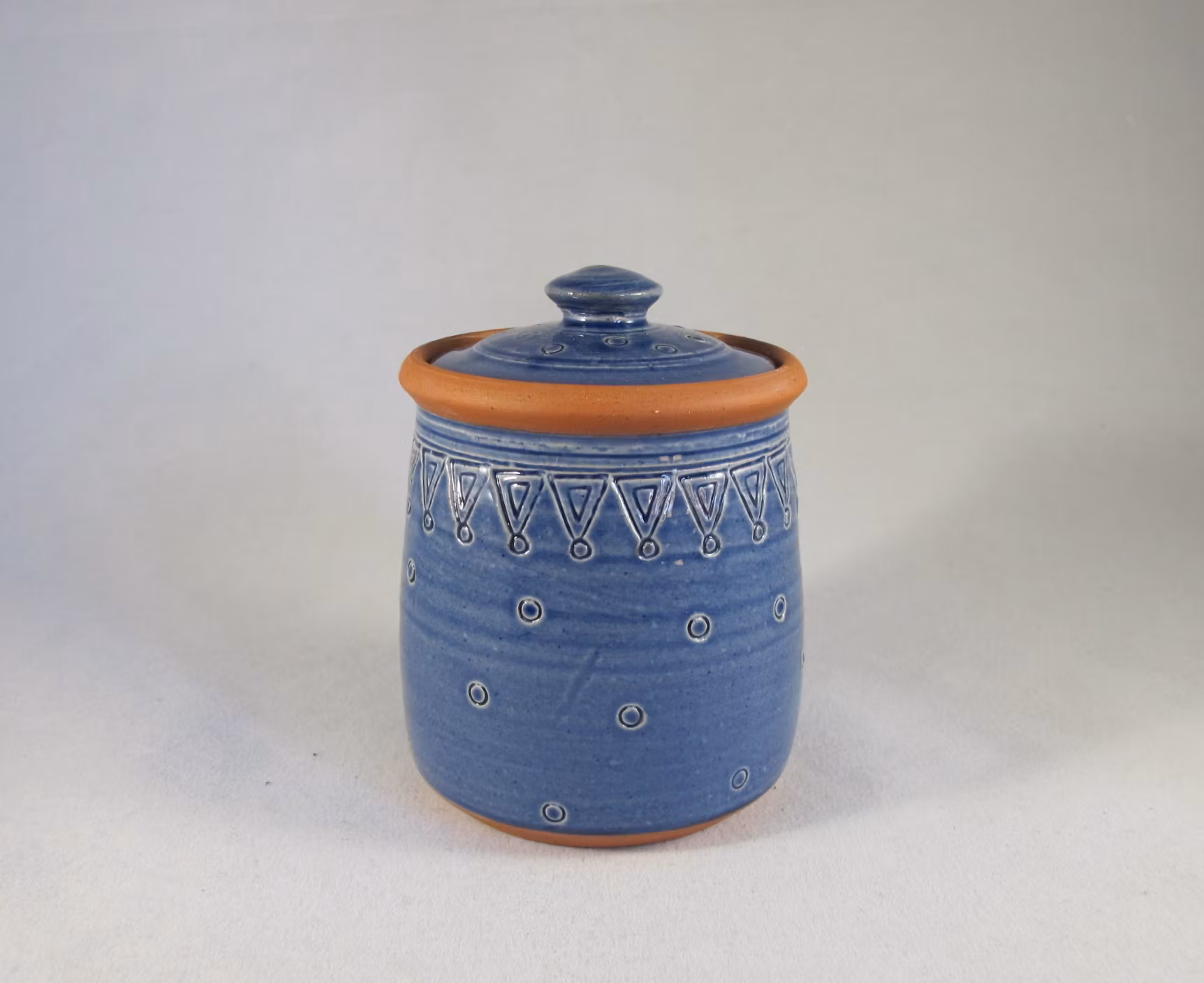 Handdrejad burk i lergods med mönster inspirerat av folkvandringstida mönster.