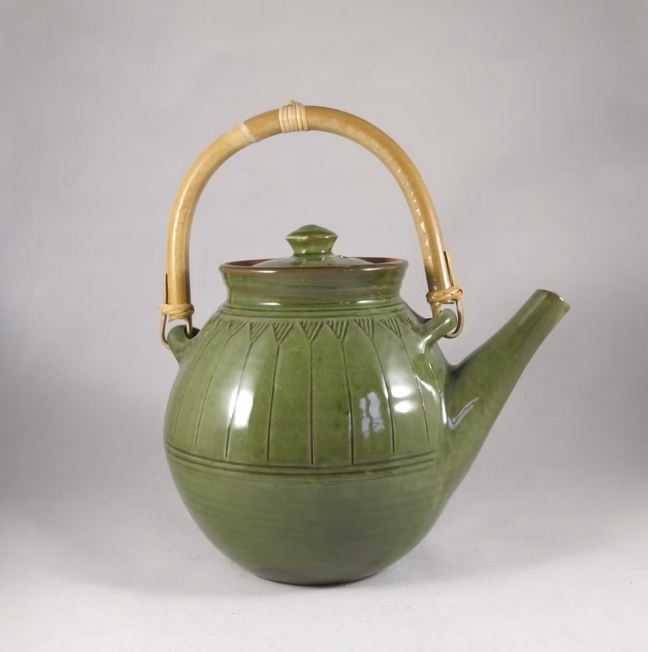 En tekanna med triangelmönster på överdel och lock. Drejad och begjuten med en vit piplera och därefter glaserad. Insidan är även den glaserad.