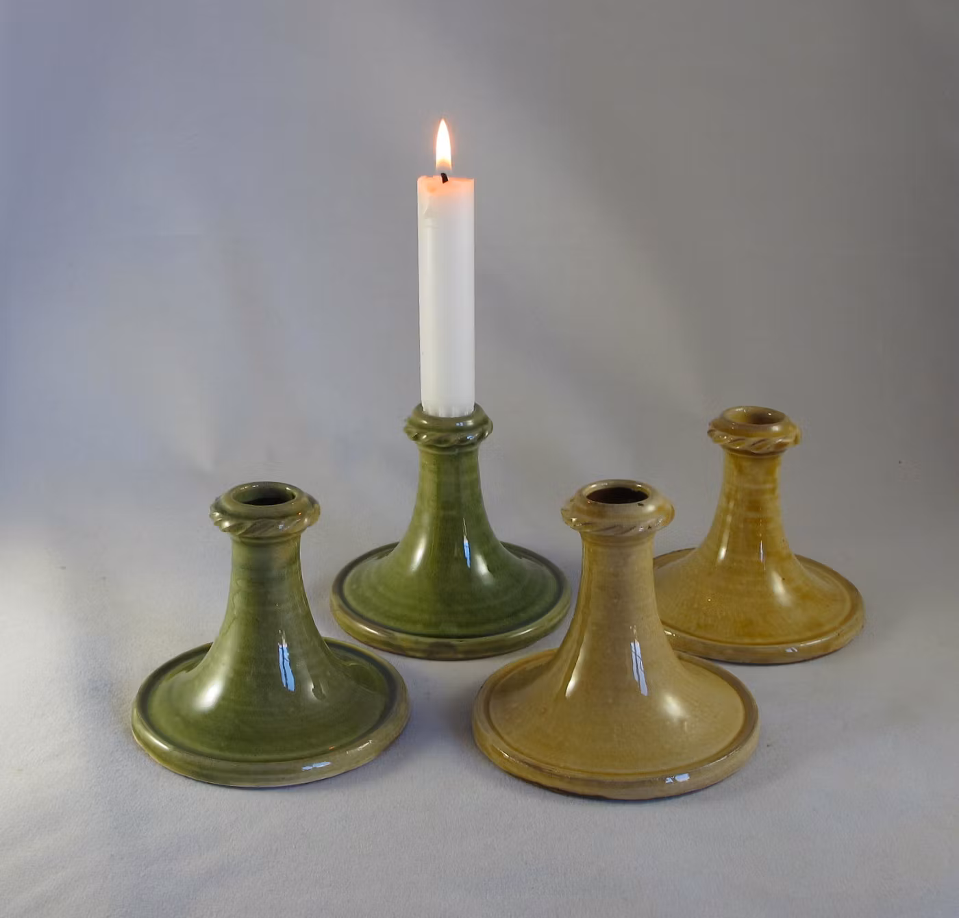 Ljusstaken som är drejad i rödlera har fått ett lager vit engobe och senare glaserad med gul eller grön glasyr.