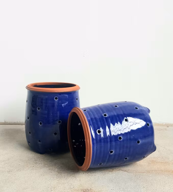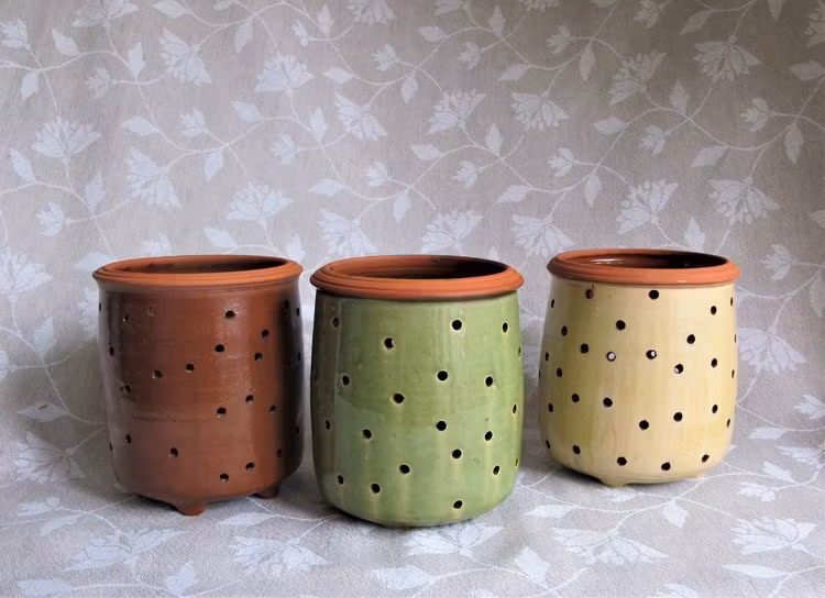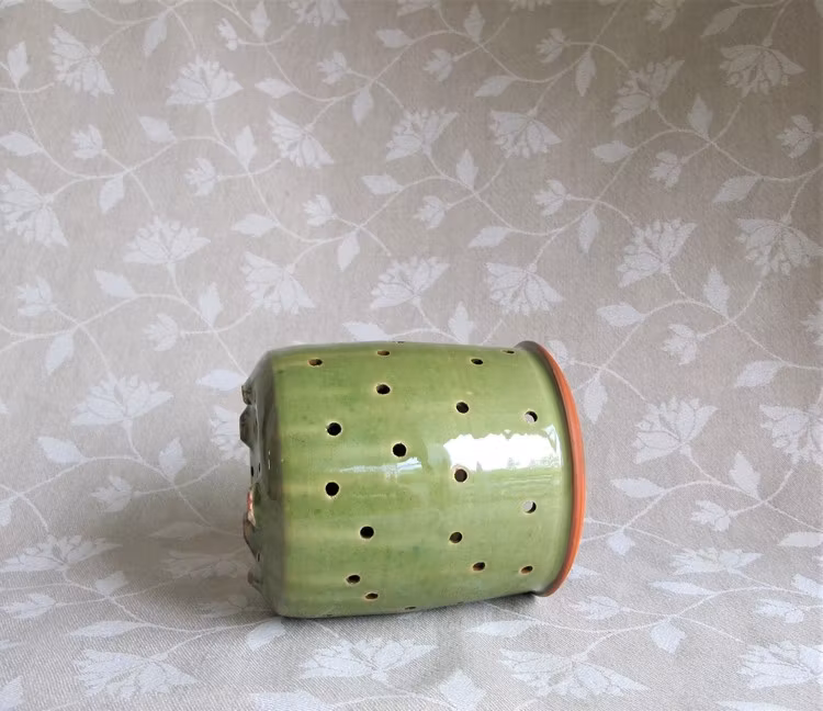 Slipwarepot for cutlery available in green, yellow or the natural redbrown colour of the clay.