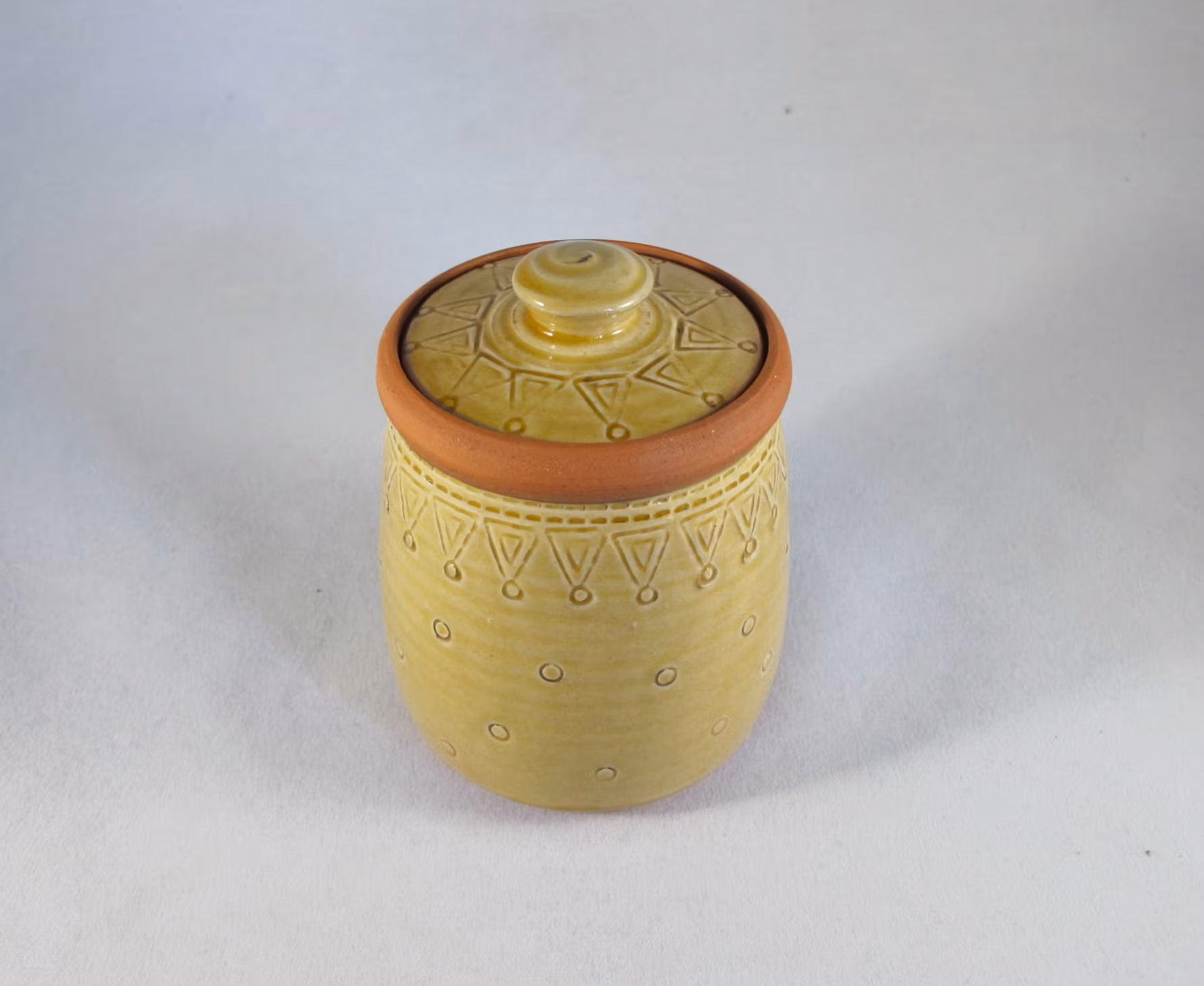Handdrejad burk i lergods med mönster inspirerat av folkvandringstida mönster.