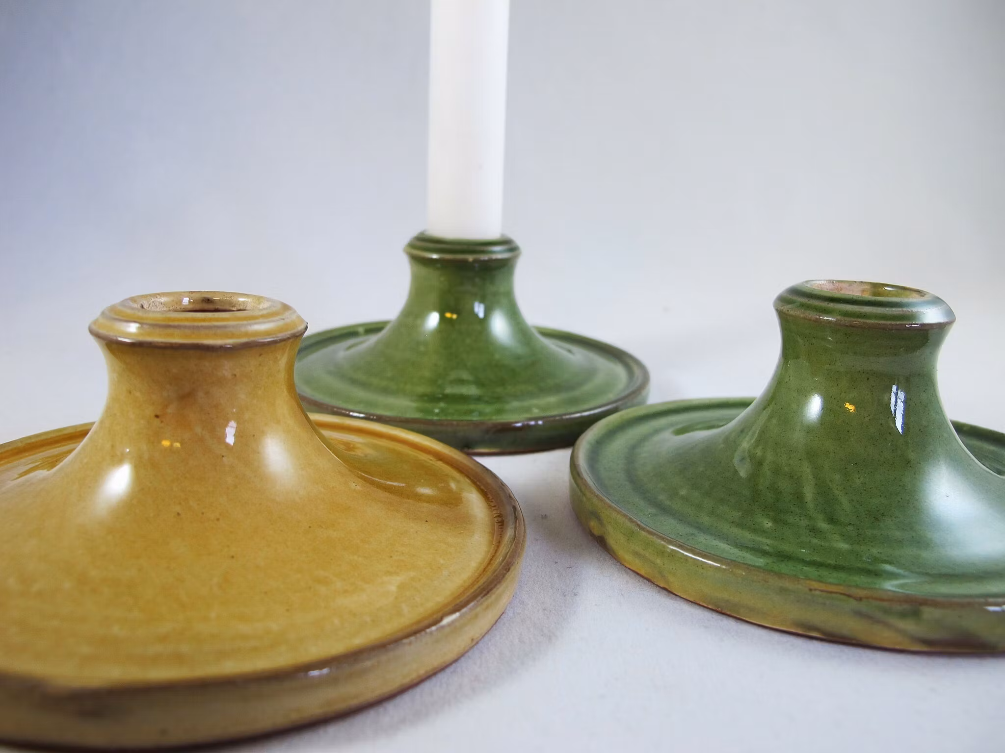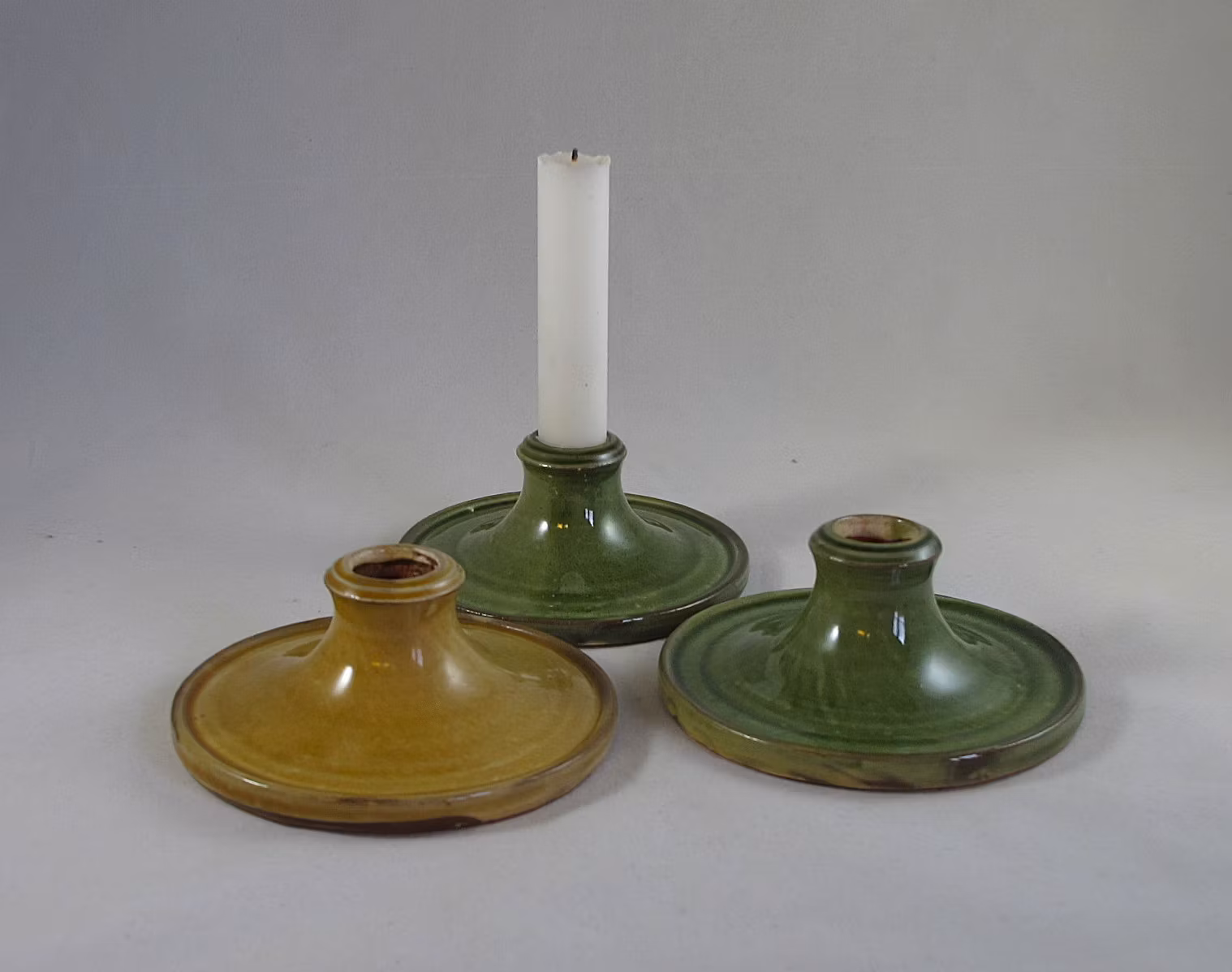 Ljusstaken som är drejad i rödlera har fått ett lager vit engobe och senare glaserad med gul eller grön glasyr.