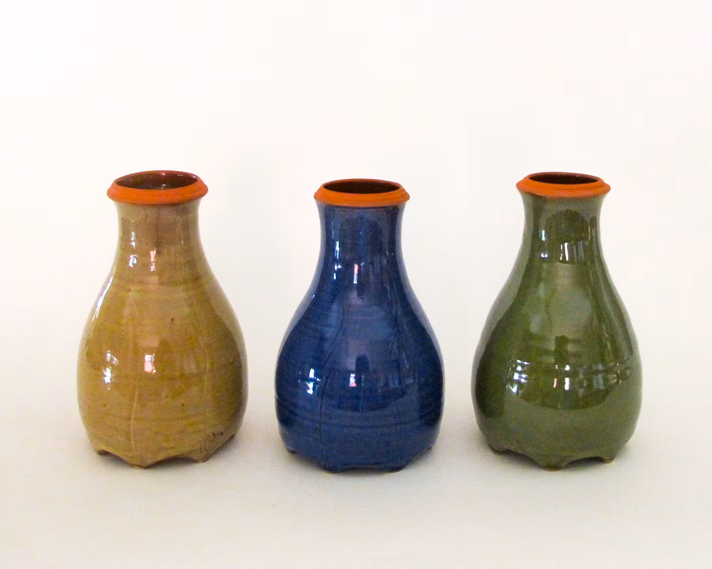 A vase thrown in red clay with modelled feet. After getting a comb pattern, it has been dipped in engobe. After a first firing, it has received one of three glazes. Blue, green or yellow.
