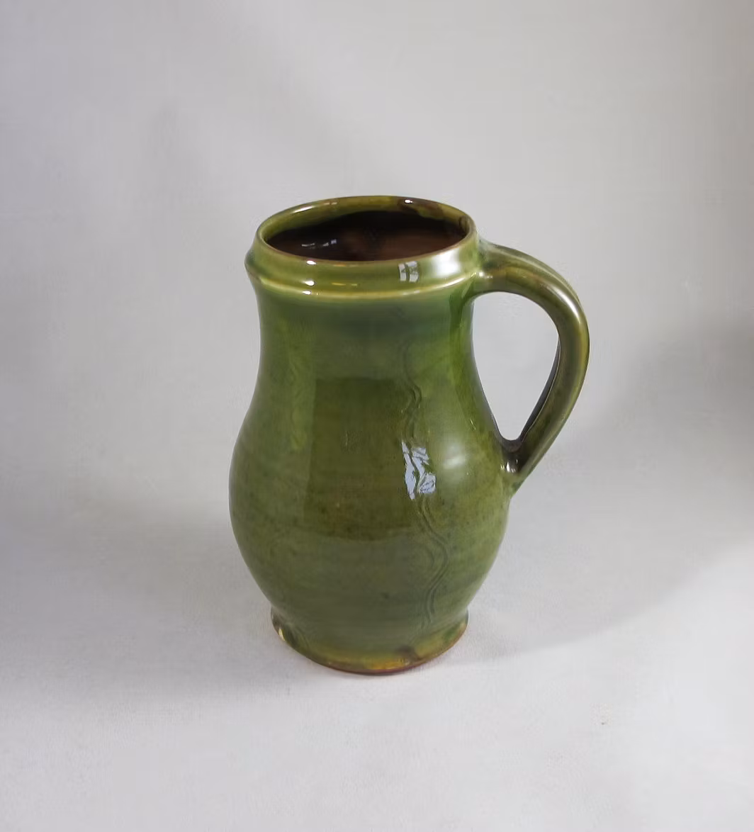 A big version of the jugs. Thrown in earthenware and with a coating of white slip. The glazed with a green glaze that bring out the comb pattern.