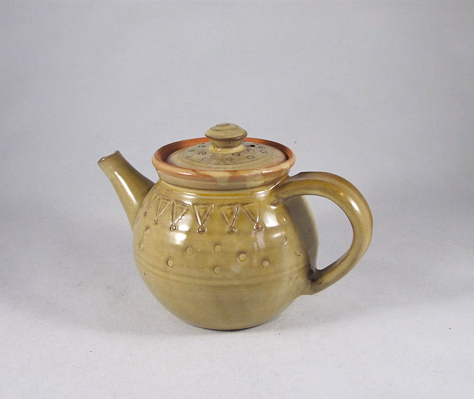 The teapot is made of a red clay which, after being decorated, has been covered in a white slip. After a first firing, it has received its yellow glaze.