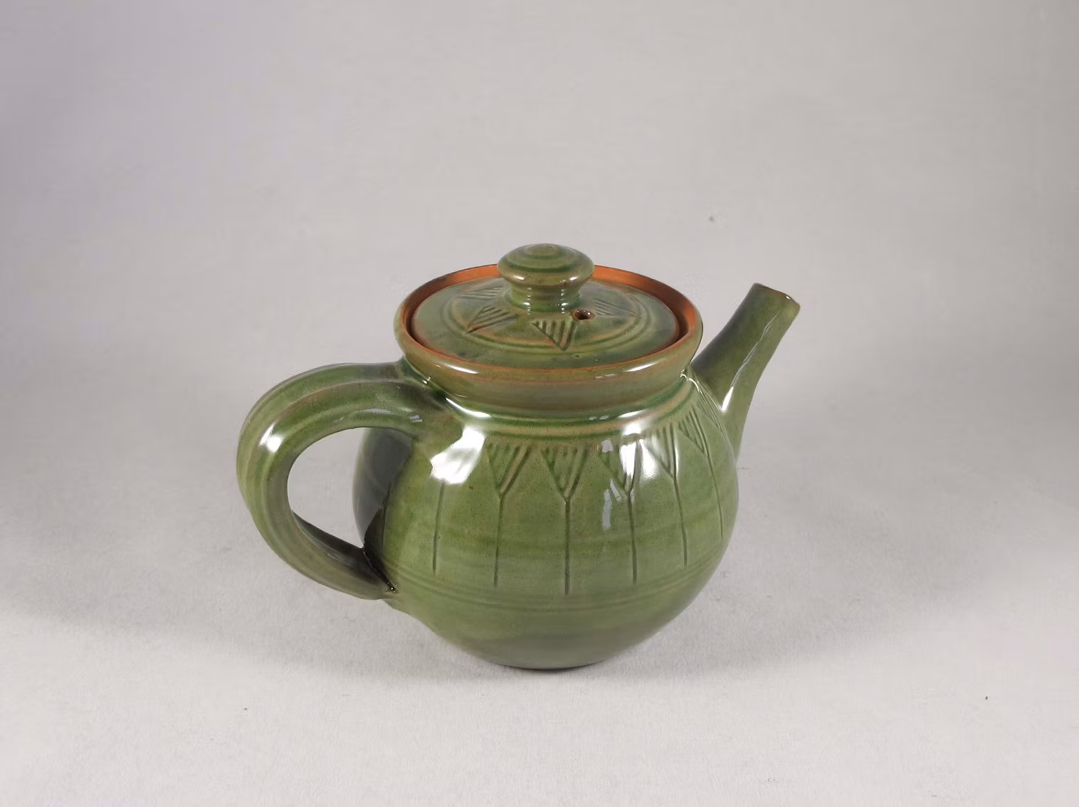 The teapot is made of a red clay which, after being decorated, has been covered in a white slip. After a first firing, it has received its green glaze.