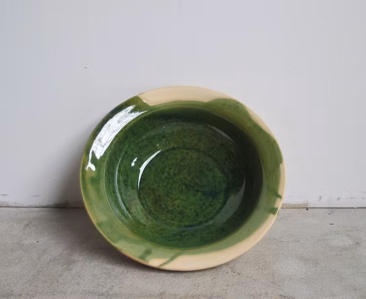 Ett grönglaserad fat efter fynd från England. Daterat till 1250-1300.