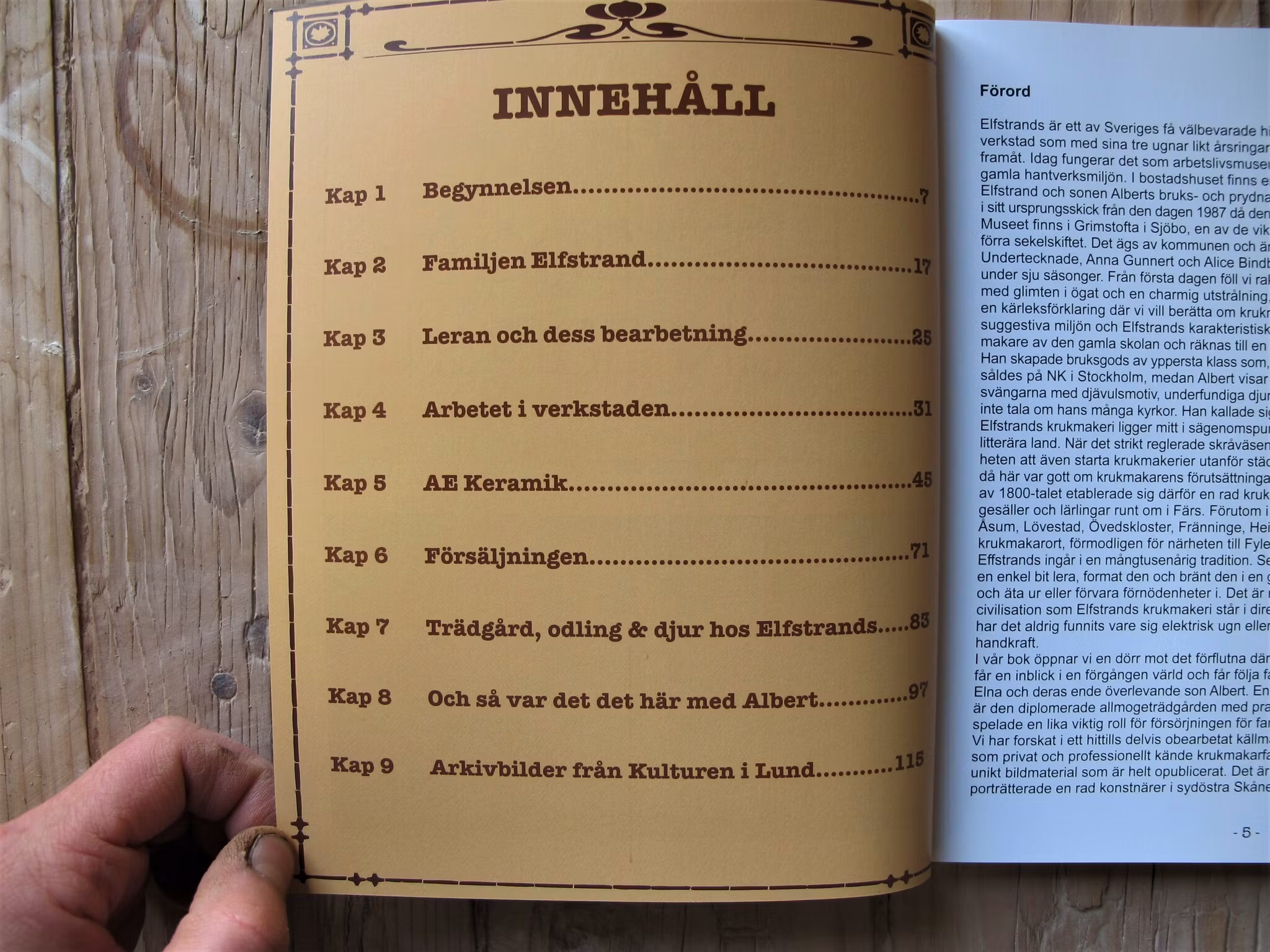 Elfstrands krukmakeri i Sjöbo är ett av Sveriges äldsta krukmakerier med bevarade ugnar och interiörer, verkstad och bostadsdel. Likt årsringar kan man läsa historiens gång från 1880-talet fram till den dag då den siste krukmakaren gick ut genom dörren 1987. De mångåriga guiderna på museet, Anna Gunnert och Alice Bindby, har kommit ut med en bok där de öppnar en dörr mot det förflutna och låter läsaren följa familjen Elfstrand; Axel med sin hustru Elna och deras ende överlevande son Albert, en man med ett alldeles särskilt förhållande till såväl leran och keramiken som till livet, kvinnor och stärkkragar…