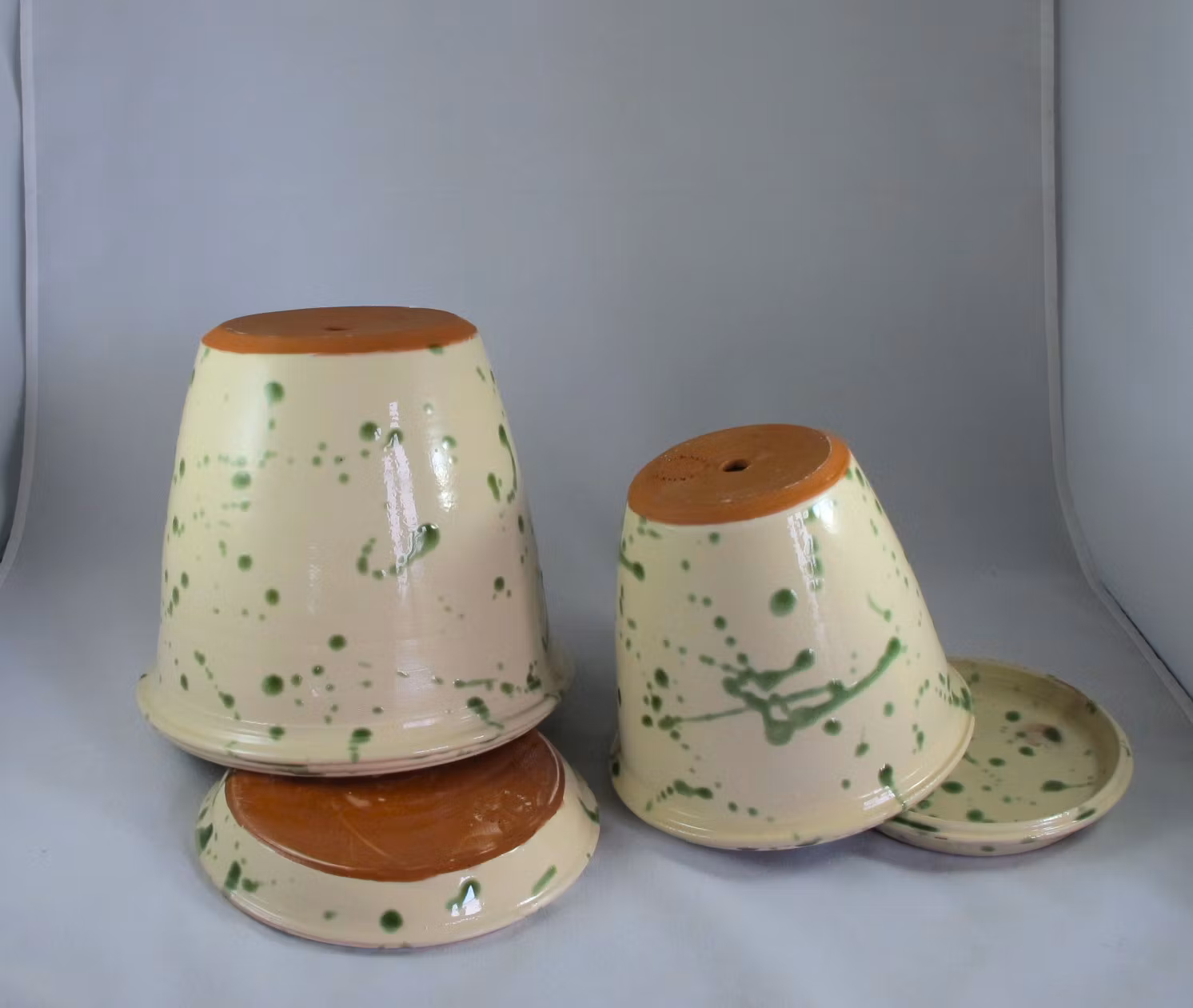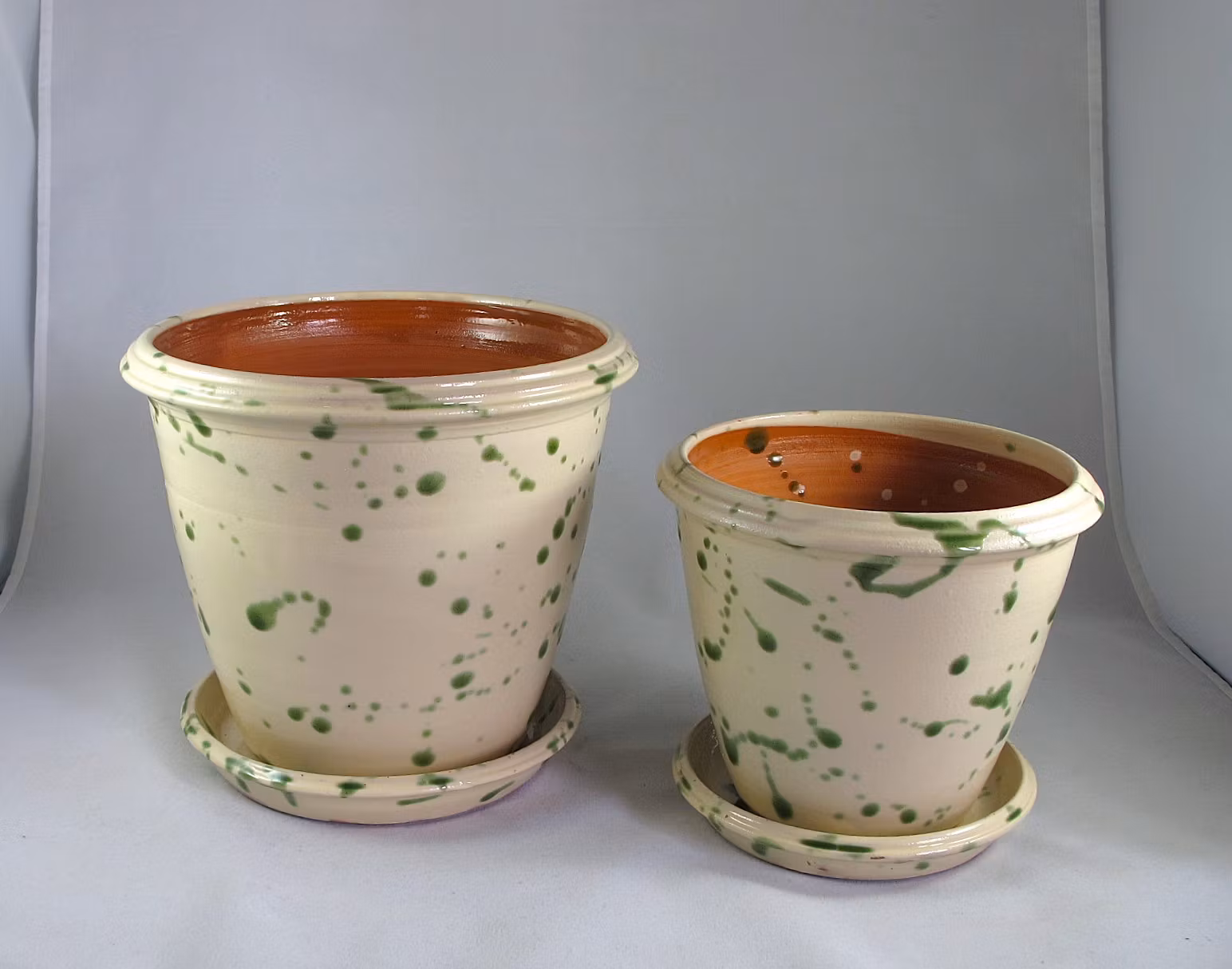 Vitglaserad kruka med gröna stänk . Fatet är även glaserat på undersidan.
