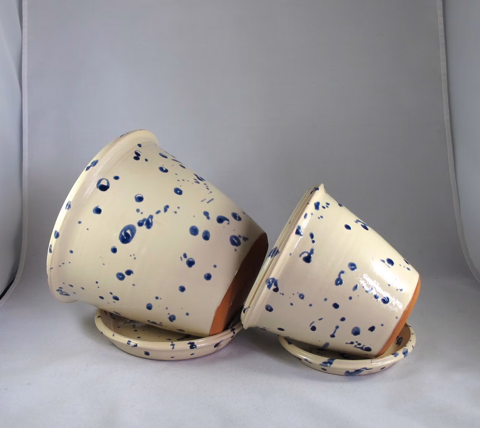 Vitglaserad kruka med blåa stänk i lergodslera. Det inkluderade fatet är även glaserat på undersidan.