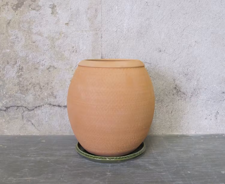 Kruka i lergods med en yta som har en barkliknande struktur. Kommer med ett grönglaserat fat.