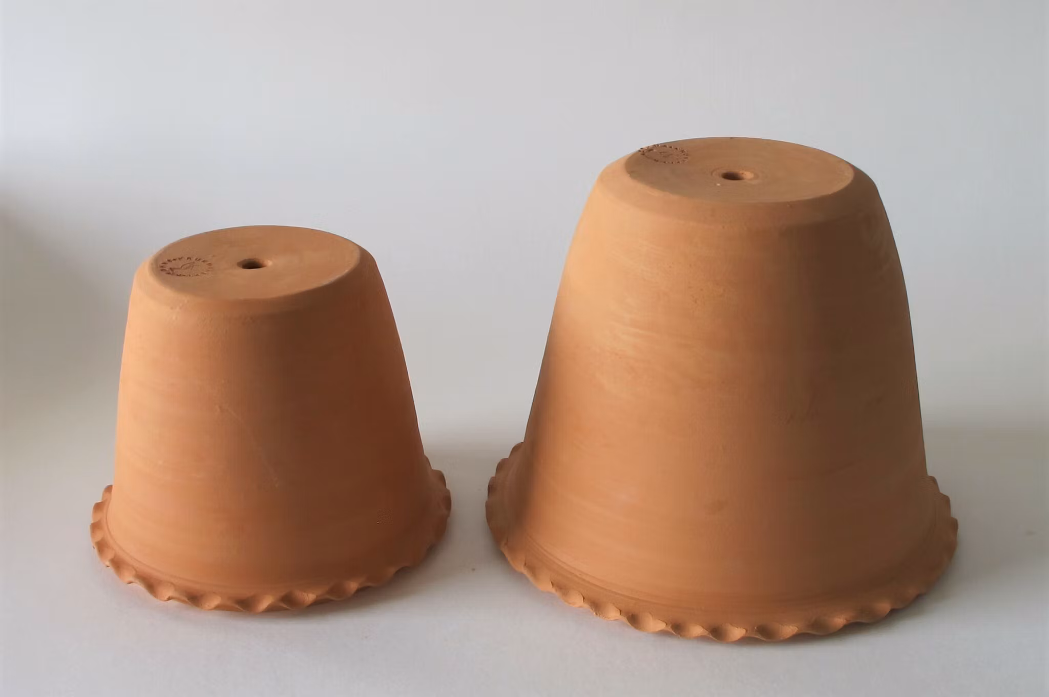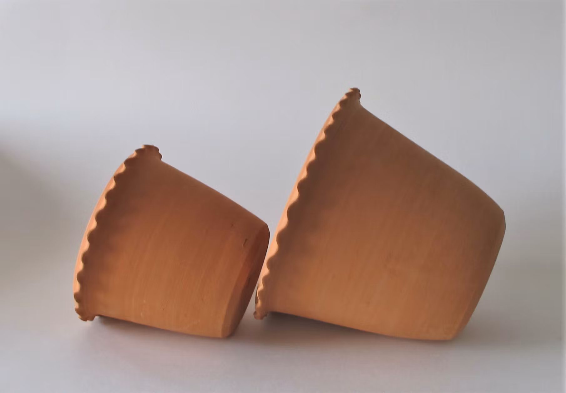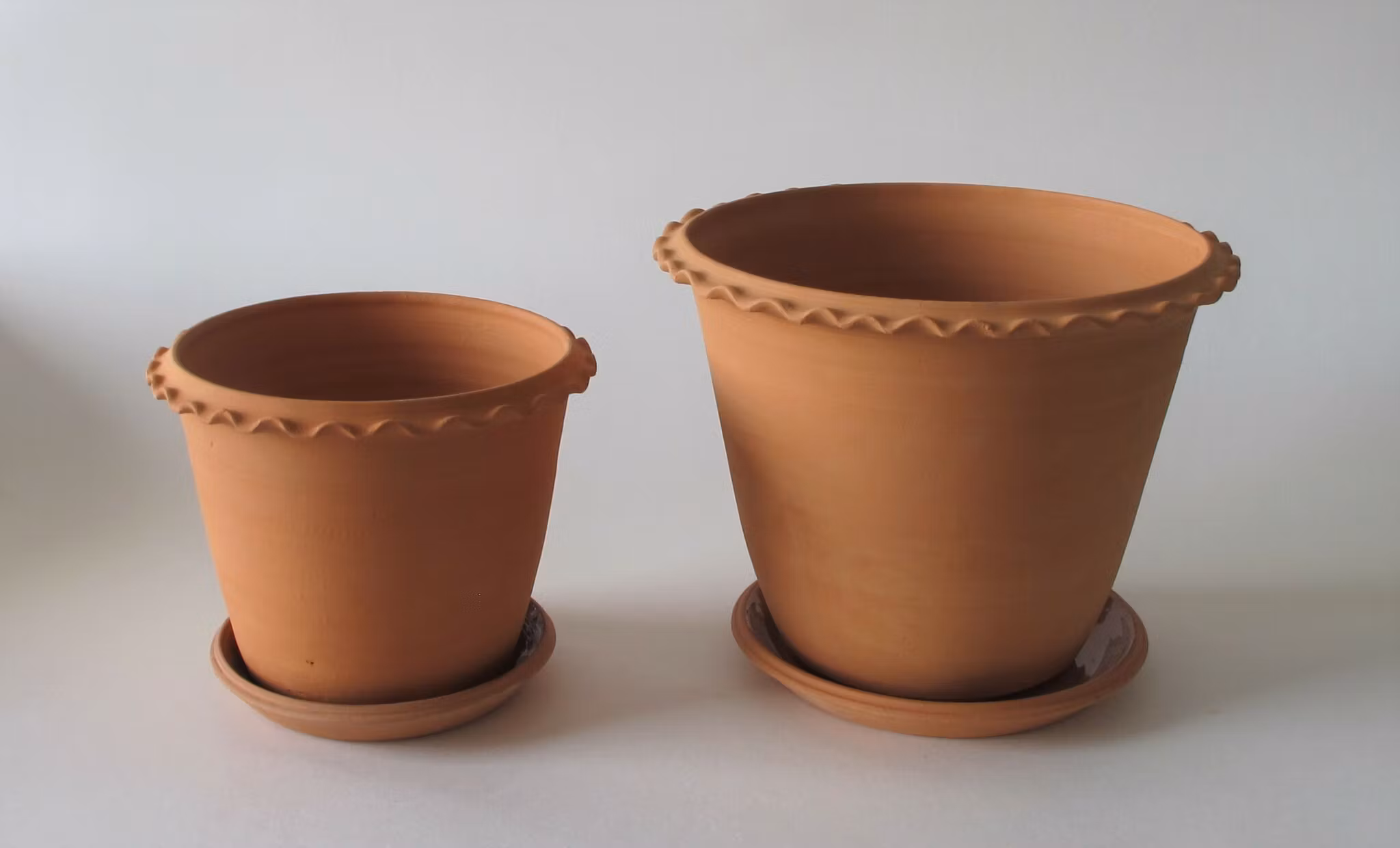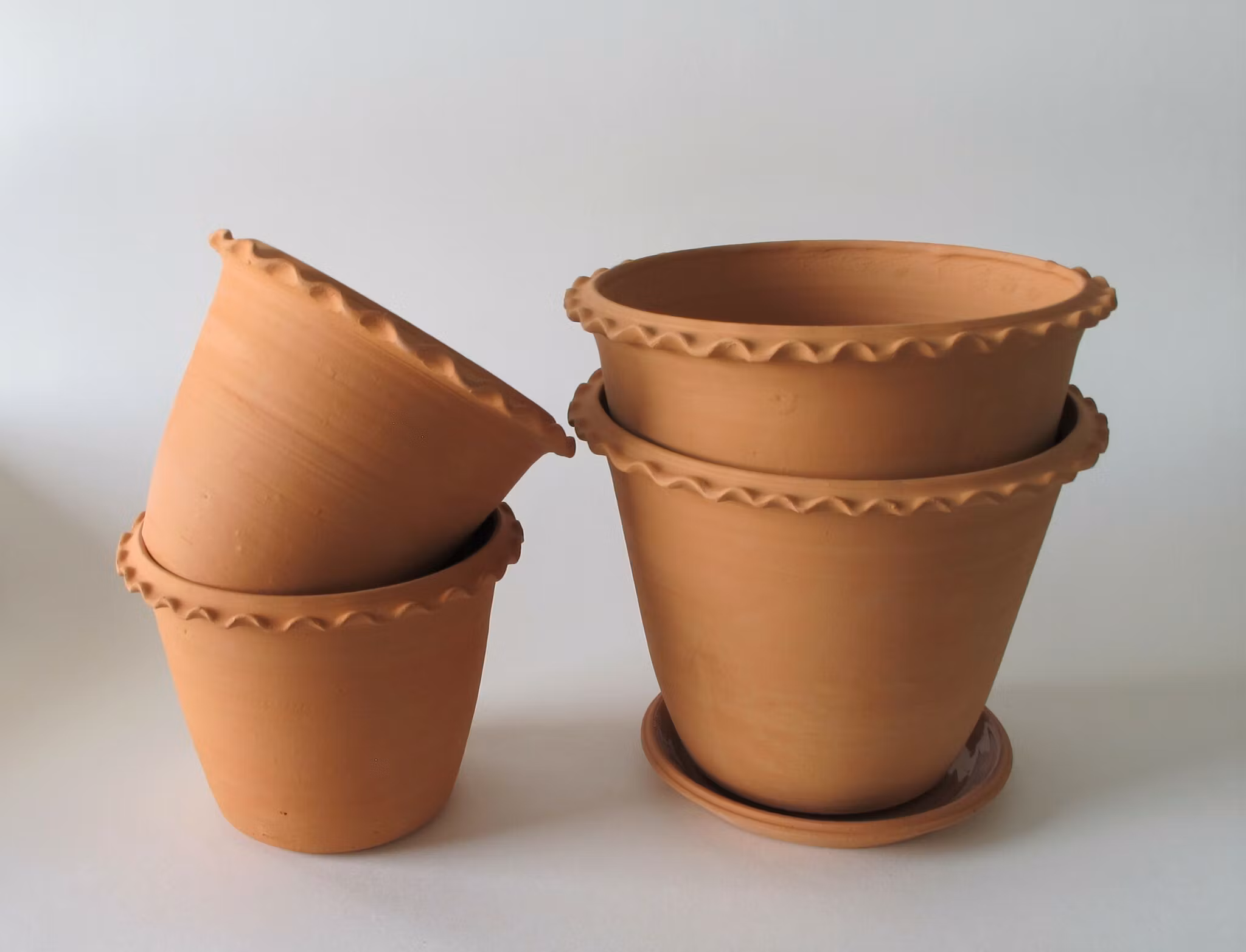 Handdrejade blomkrukor med kruskant i lergods. Säljes med ett glaserat fat.
