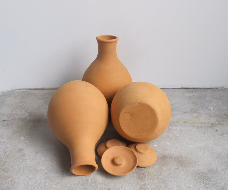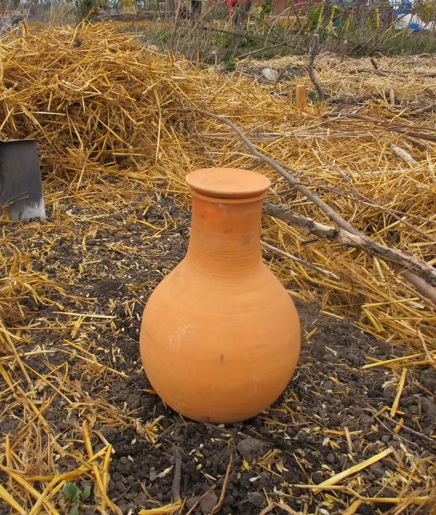 Krukan grävs ner i trädgårdslandet så att bara översta delen av halsen är synlig.